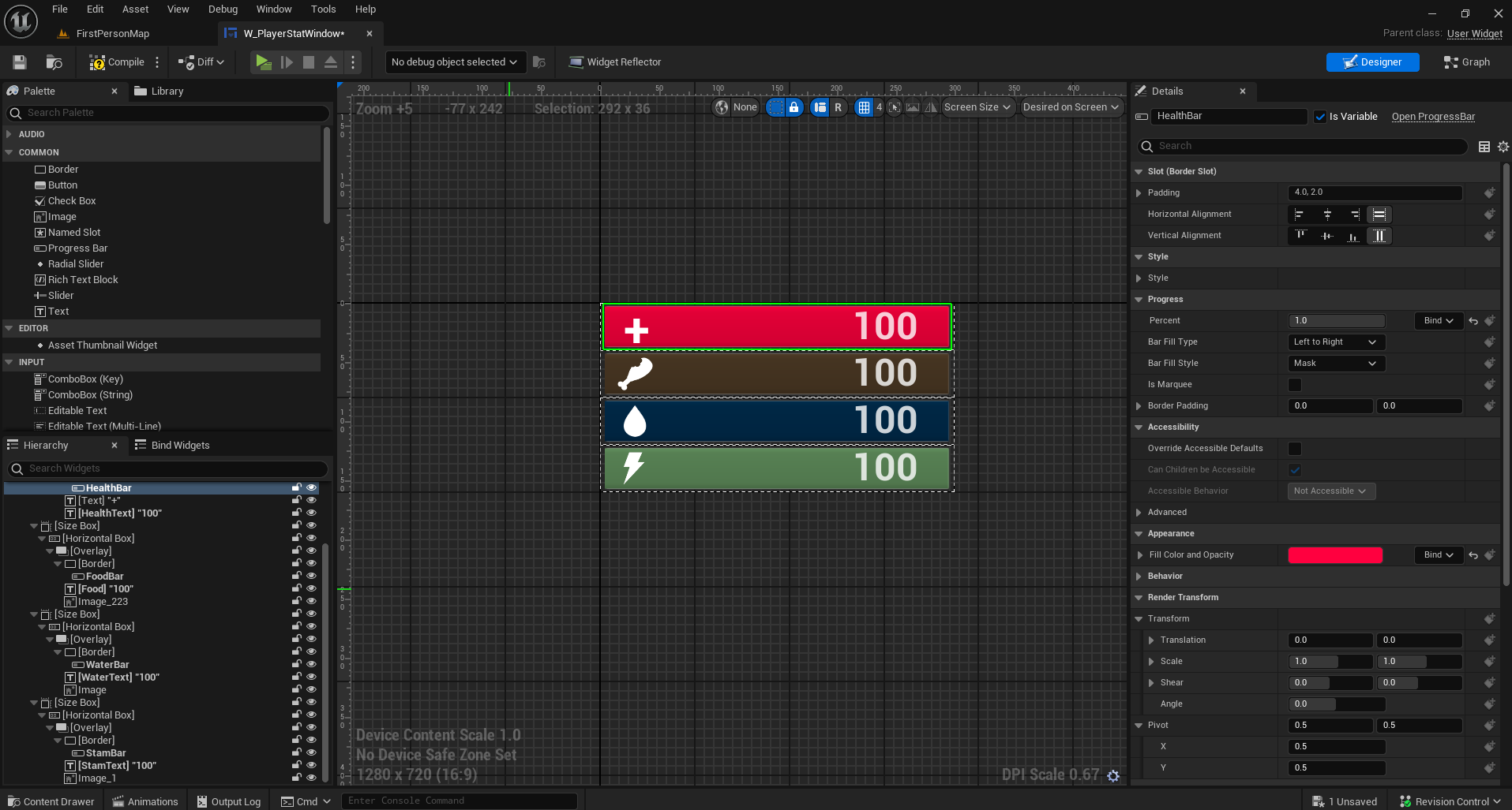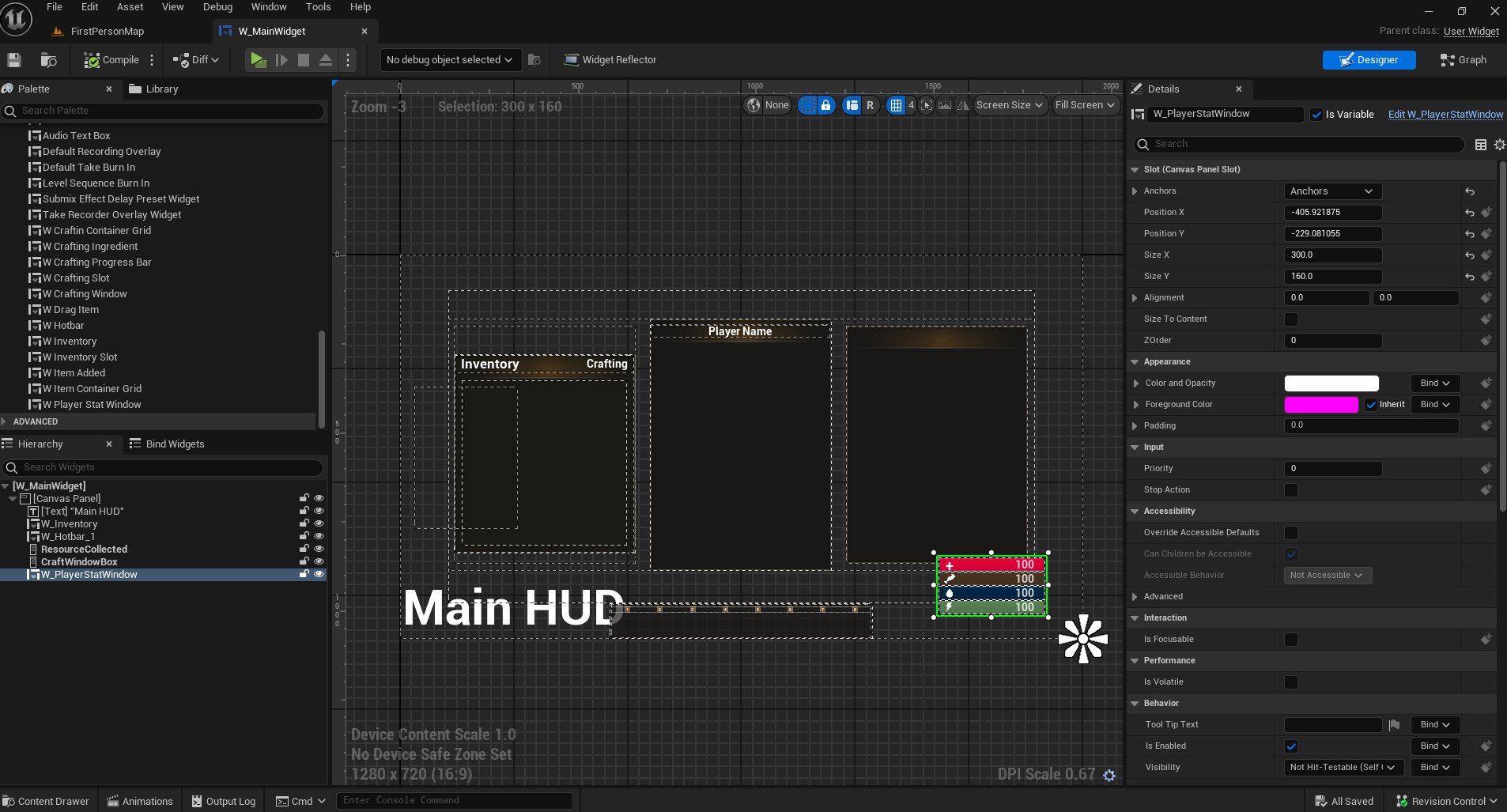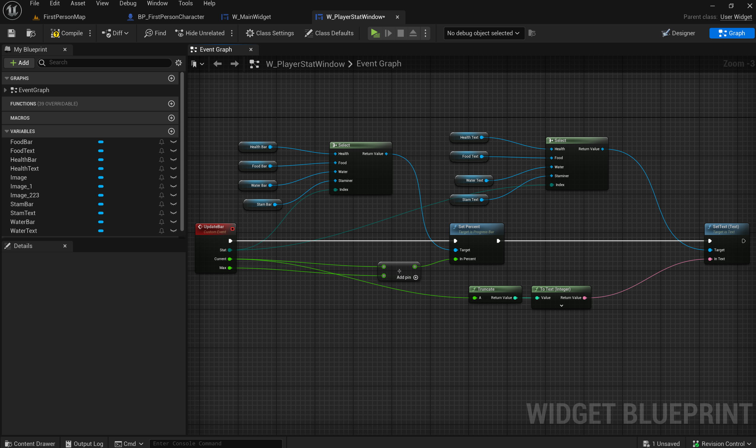 1. 메인 위젯에 플레이어의 Chracter Stat를 표현하는 언리얼 Widget을 제작하여 플레이어 창에 나오도록 연결 작업