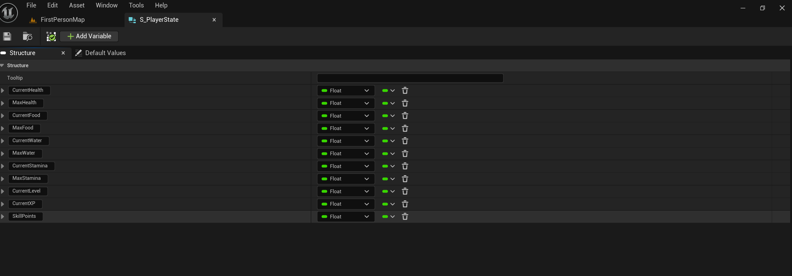 - 메인캐릭터 블루프린트의 변수 항목에 Player Stats를 추가