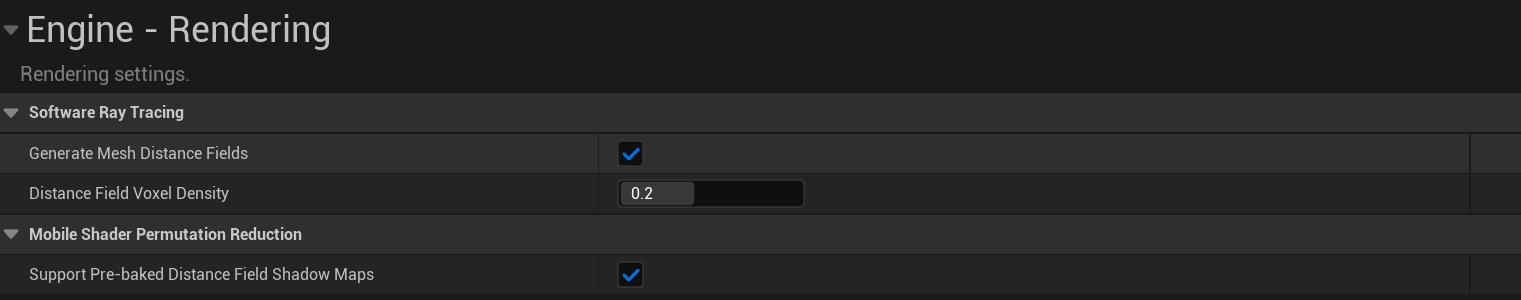 (lumen & Detail Tracing & Hardware Raytrace On & Auto Exposure 0.0 & Generated Mesh Distance Field 체크)