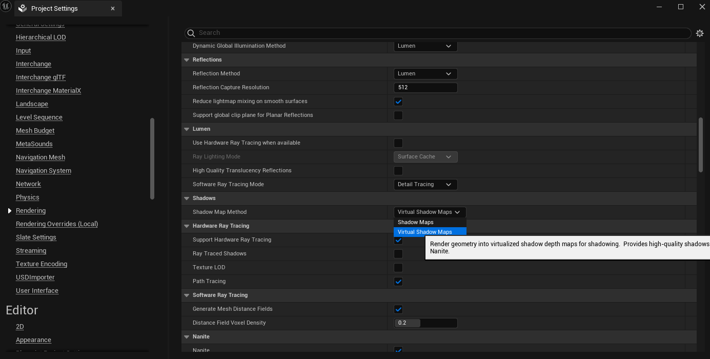 - 언리얼 엔진5는 그림자 생성 방식에 있어서 이전(ShdowMap)과 다른 방식의 버츄얼 섀도우 맵을 사용