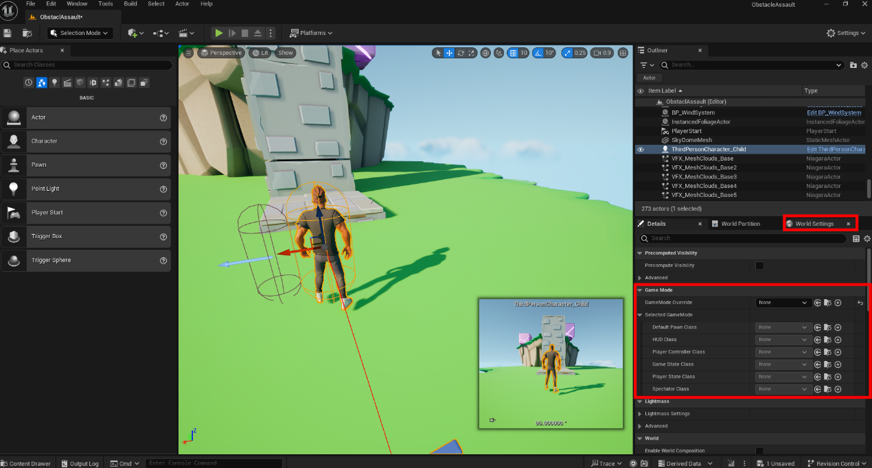 현재 레벨을 시작하면 PlayerStart를 사용하지 않고 초기 캐릭터를 배치해 두었는데, 테스트용(특정 위치에서 시작 등) 플레이시 항상 블루프린트 캐릭터 위치에 스폰하는 현상이 발생하고 있다. 따라 만들고 있는 예제 영상에서는 일부러 이러한 문제점을 보여주고 게임모드라는 개념을 알 수 있도록 구성해 놓았다.