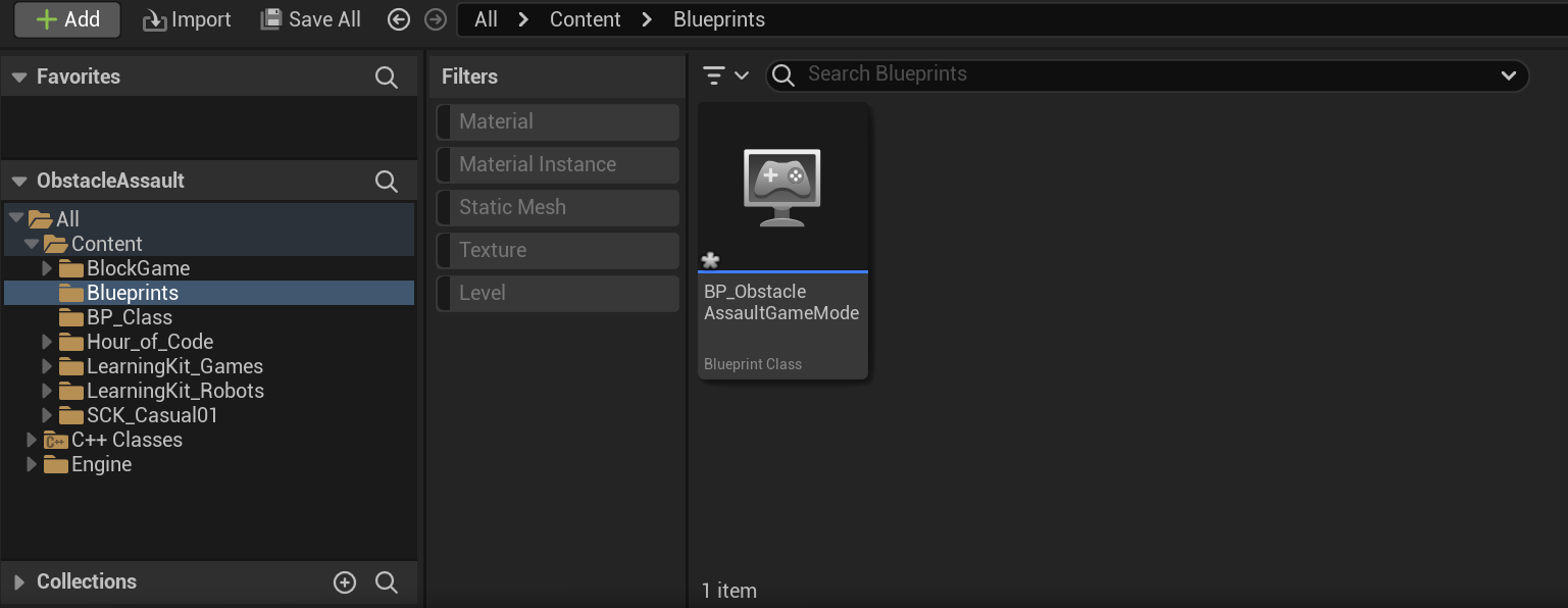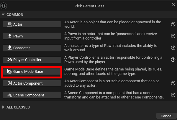 2.ContentsBrowser -> 우클릭 -> BluprintClass -> GameModeBase
