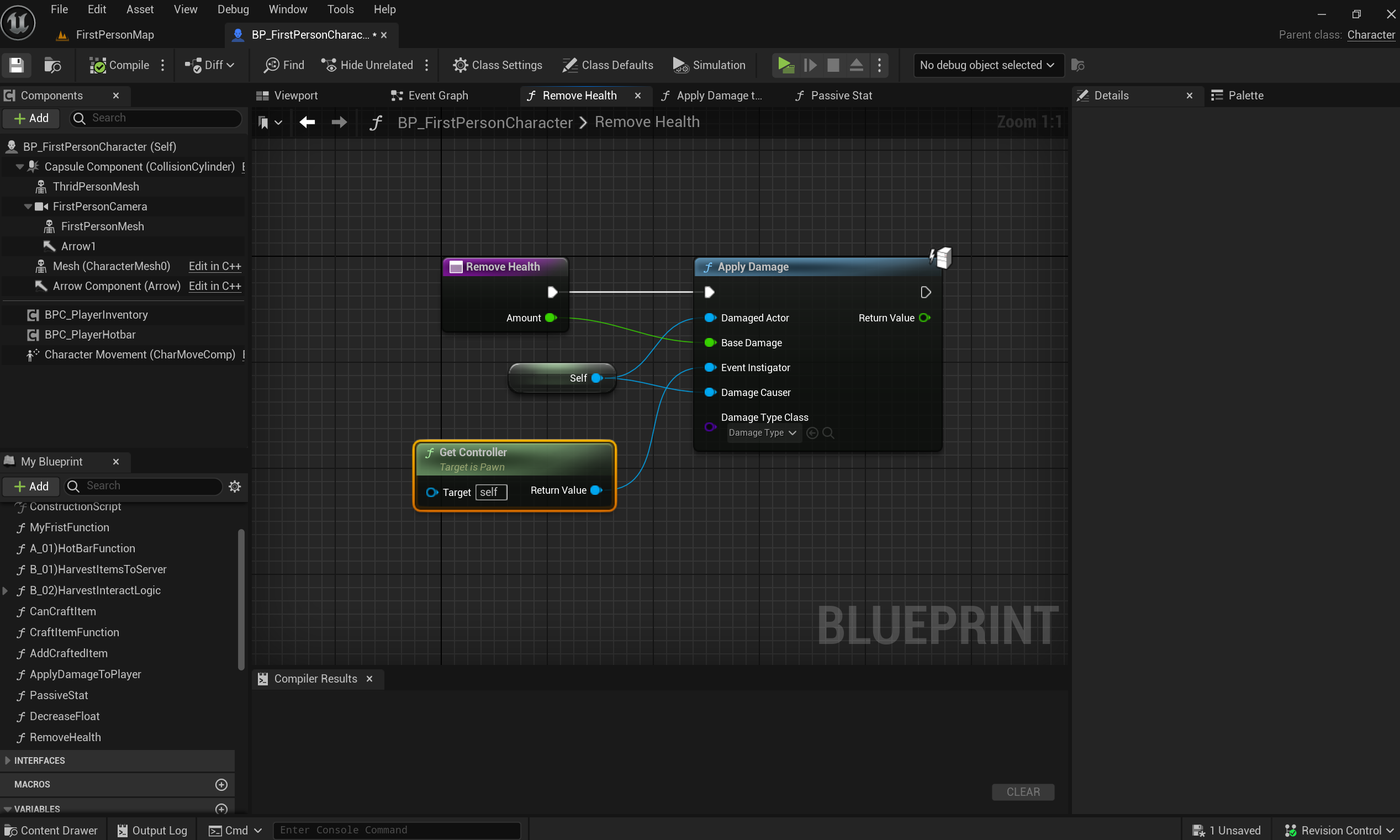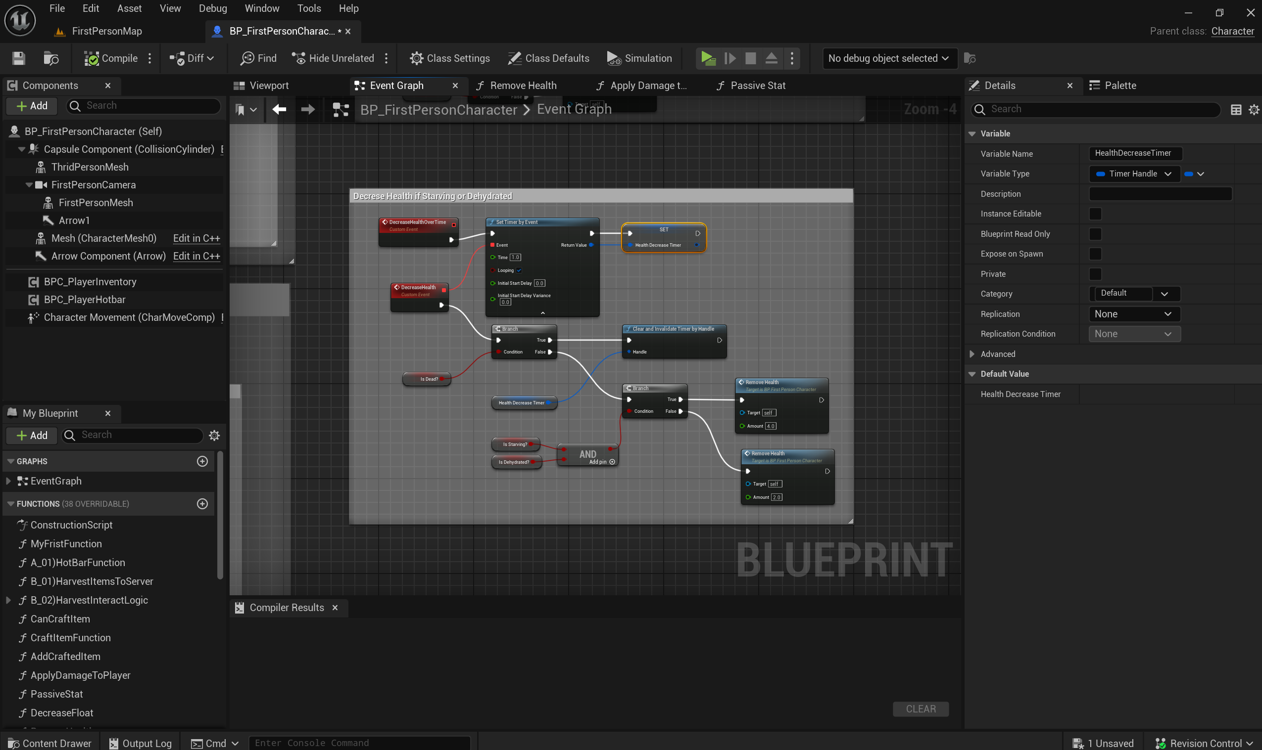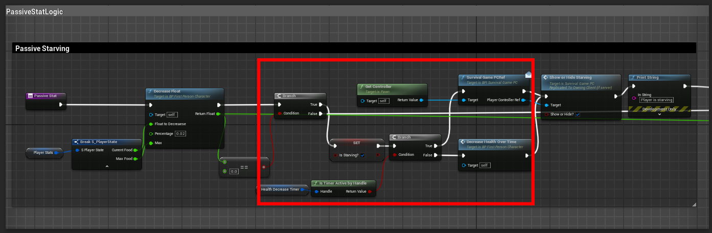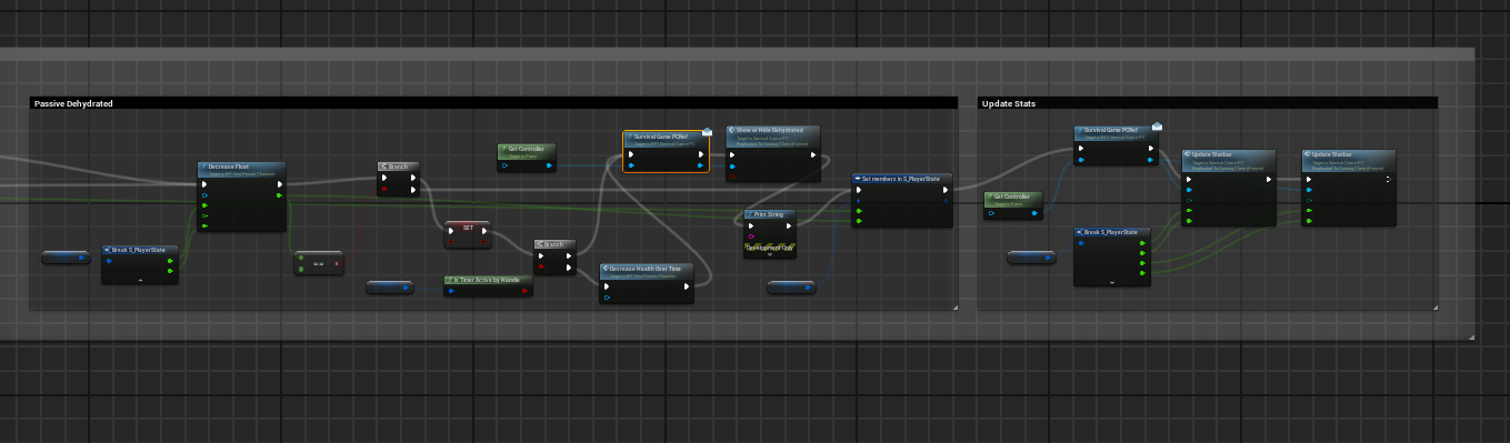 - SetTimer와 Bool을 이용해서 Is Starving & Is dehydrayed? 여부를 체크 / PassiveStat Function에도 관련하여 내용 반영