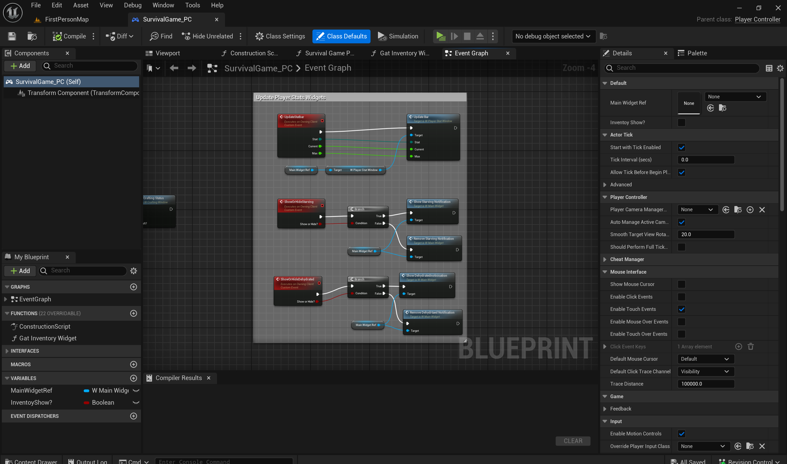 - W_StatNotificationWidget의 EventGraph 항목은 디테일에 관한 기능 (체력 / 빨강 - 수분 / 파랑, 텍스트 메세지 및 애니메이션 출력)