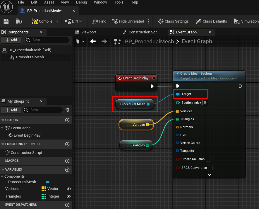 - Procedural Mesh 컴포넌트를 Create Mesh Section에 연결(EventGraph)