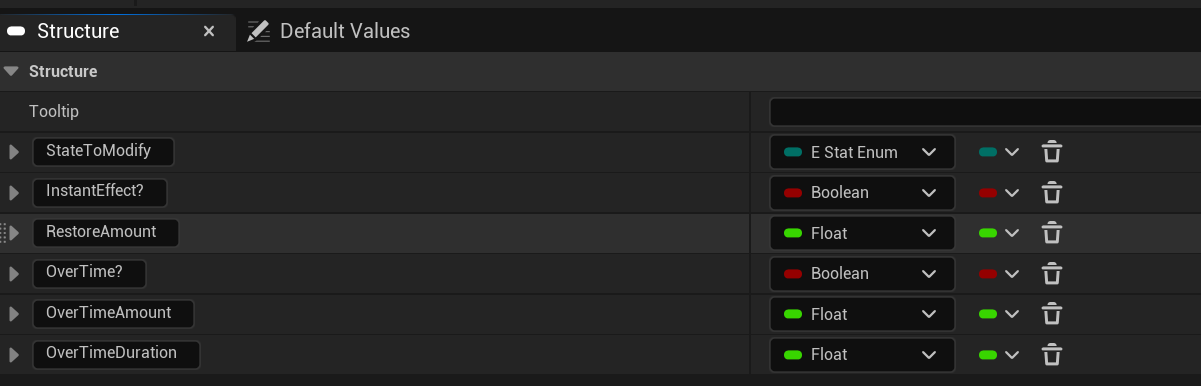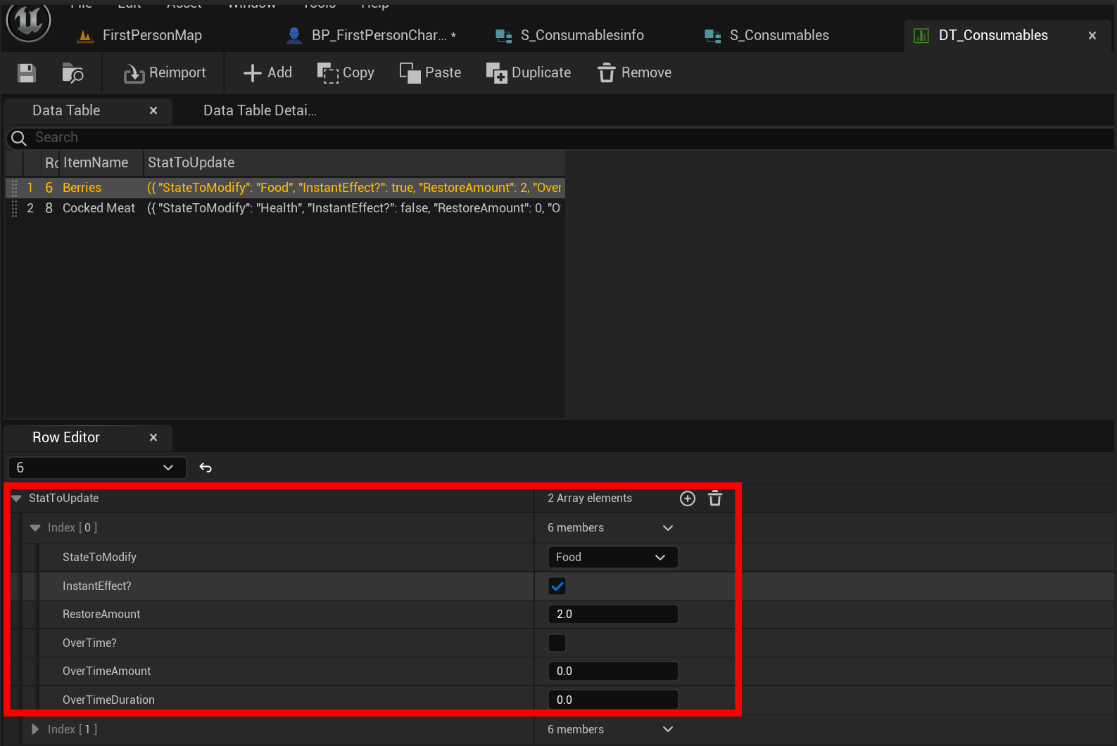 - 아이템 소비에 사용되는 리스트를 추리기 위한 데이터 테이블과 블루프린트에서 해당 기능을 구현하기 위한 Structure 제작