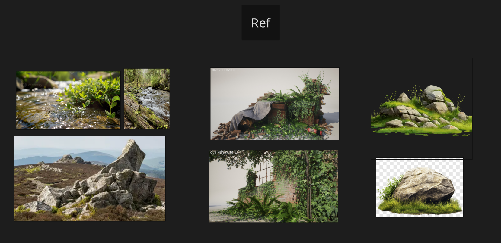 소재가 정해졌으면 렌더링을 할 소재의 참조 자료를 우선적으로 찾는 과정을 거칩니다. 이미지를 찾다보면 생각하던 돌의 형태의 모습인데 이유는 모르게 불편하다, 지금 보는 이미지는 되게 상상으로 생각했을때는 별로 였었는데 의외로 깔끔한 느낌이 든다. 같은 아티스트만의 기준점들이 생기됩니다. 특정 대상에 자연스럽게 시선을 유도하는 느낌과 그 형태들이 자연스럽게 놓이게 된 배치들의 공통점을 찾고 그것들을 종합하여 최종적으로 렌더링될 이미지의 대략적인 느낌을 그릴 수 있게 됩니다.