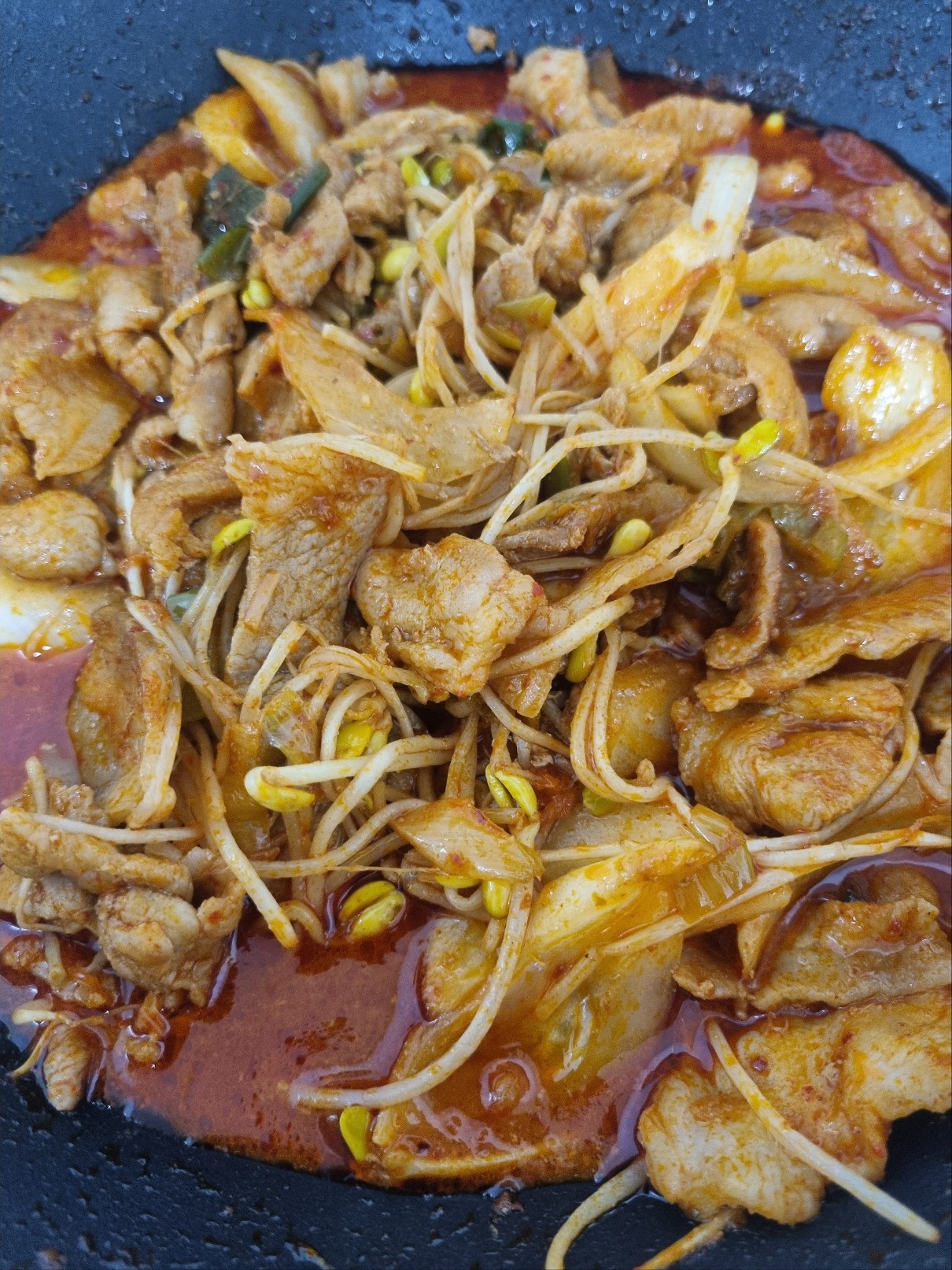 4. 채소를 넣고 볶아준 뒤, 마지막으로 콩나물을 넣어준다, 콩나물은 살짝 익히는 정도로 한다.
