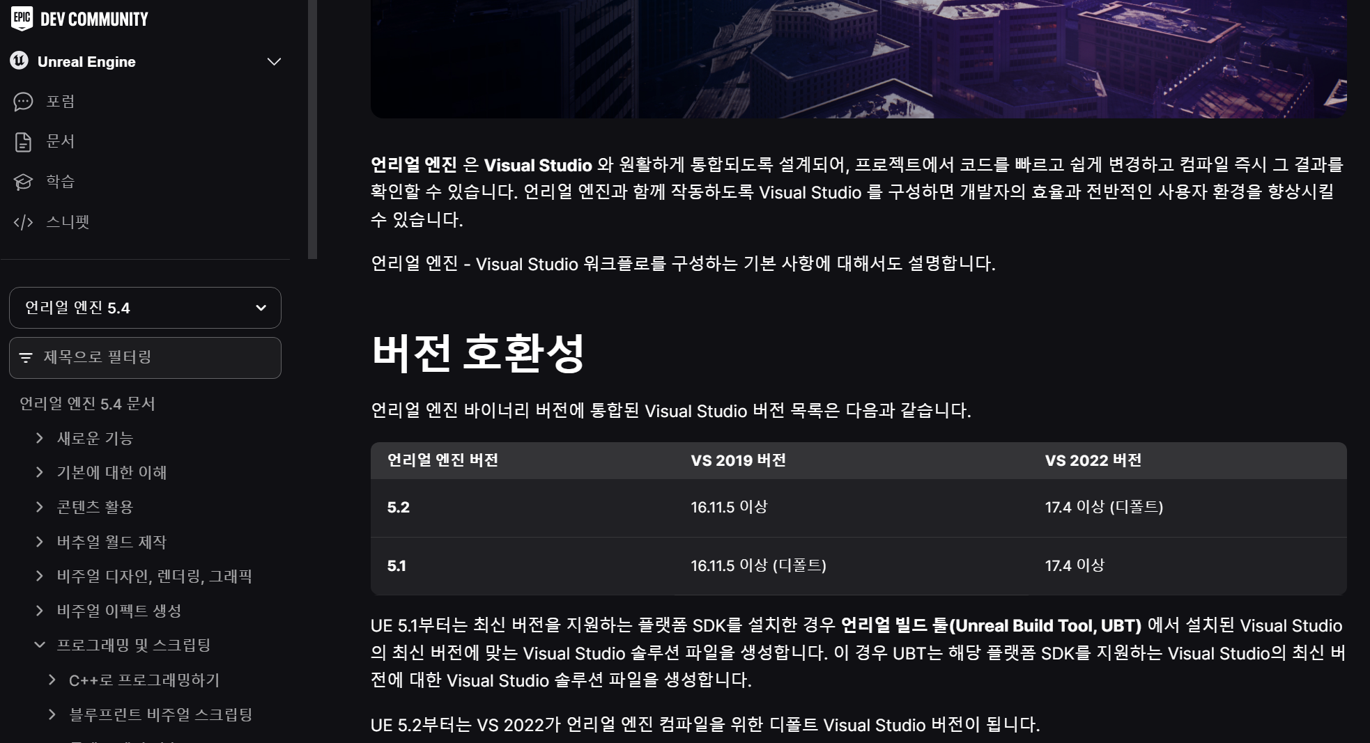 - Unreal 공식 홈페이지에서 사용하고자 하는 엔진과 호환되는 Visual Stuidio 버전 확인
