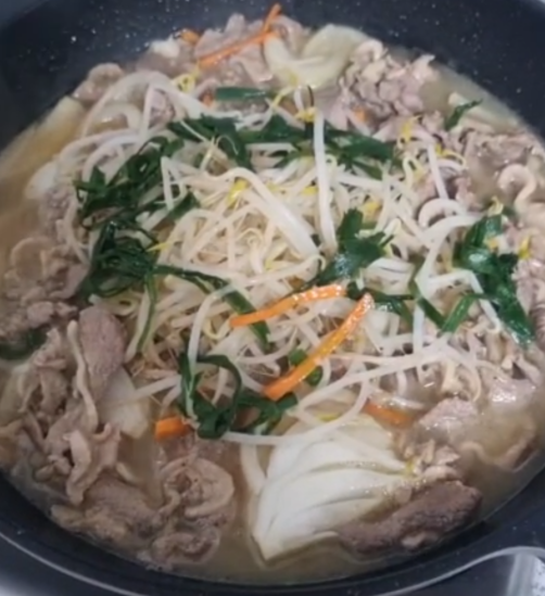 재료 / 오리고기 500g, 부추(50g), 양파(1/2개), 당근(1/4개), 숙주 2줌(160g)