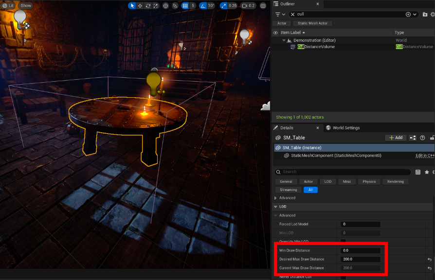 디스턴스 컬링은 카메라에서 일정거리 이상 떨어진 오브젝트를 제외합니다. 메시마다 별도로 설정해주는 것이 가능하며, Cull Distance Volume을 설정 해주면 특정 볼륨 이내의 오브젝트의 일괄적인 제어를 할수 있습니다.