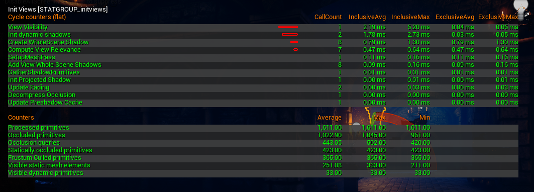 - Visibility Culling에 수행되는 비용 및 관련된 통계를 나타냅니다.