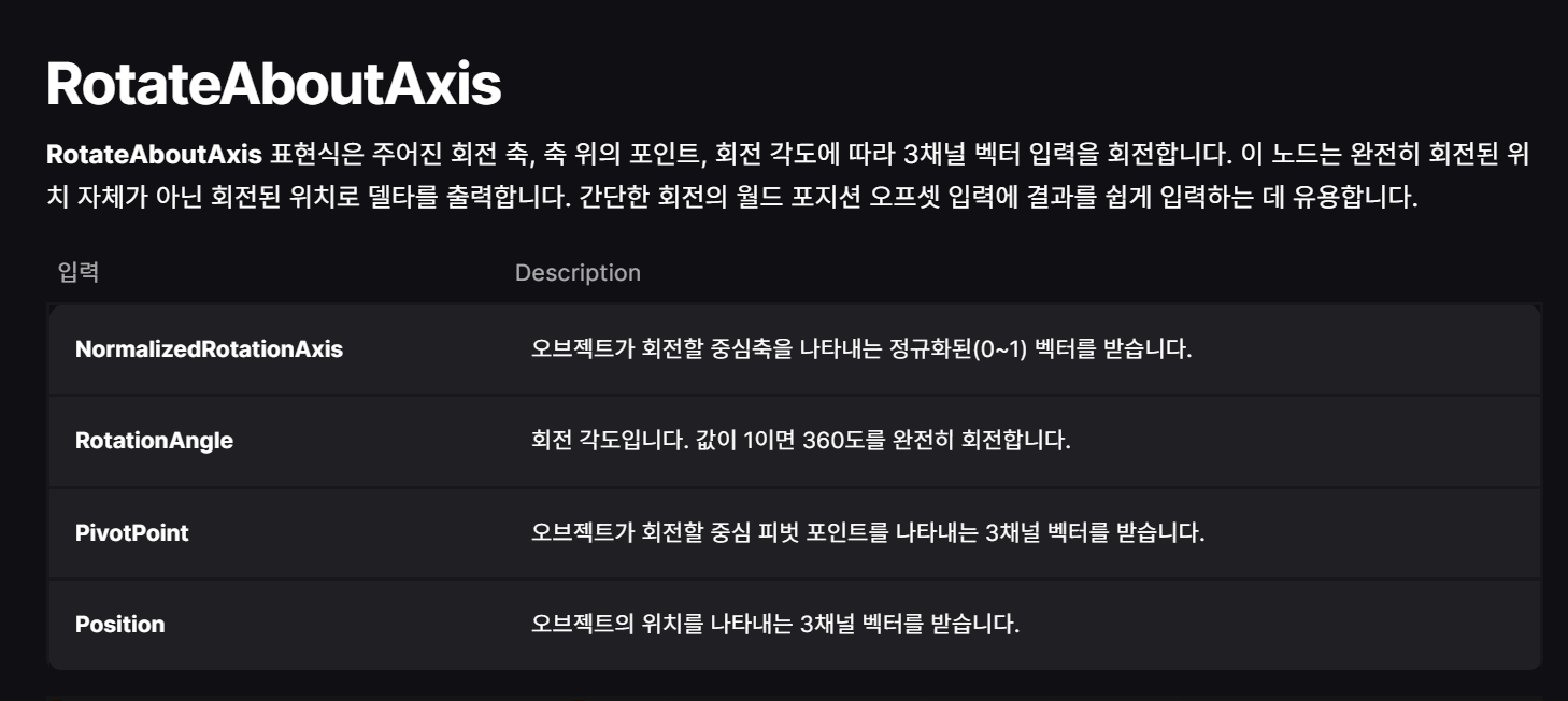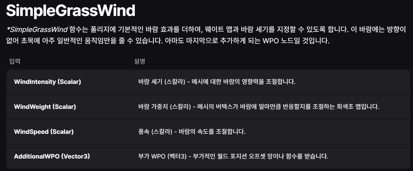 핵심개념으로 사용된 매터리얼 함수는 SimpleGrassWind와 RotateAboutAxis를 사용하여 구현되었고, 관련된 함수와 매터리얼 내에서 작용하는 역할은 다음과 같습니다.