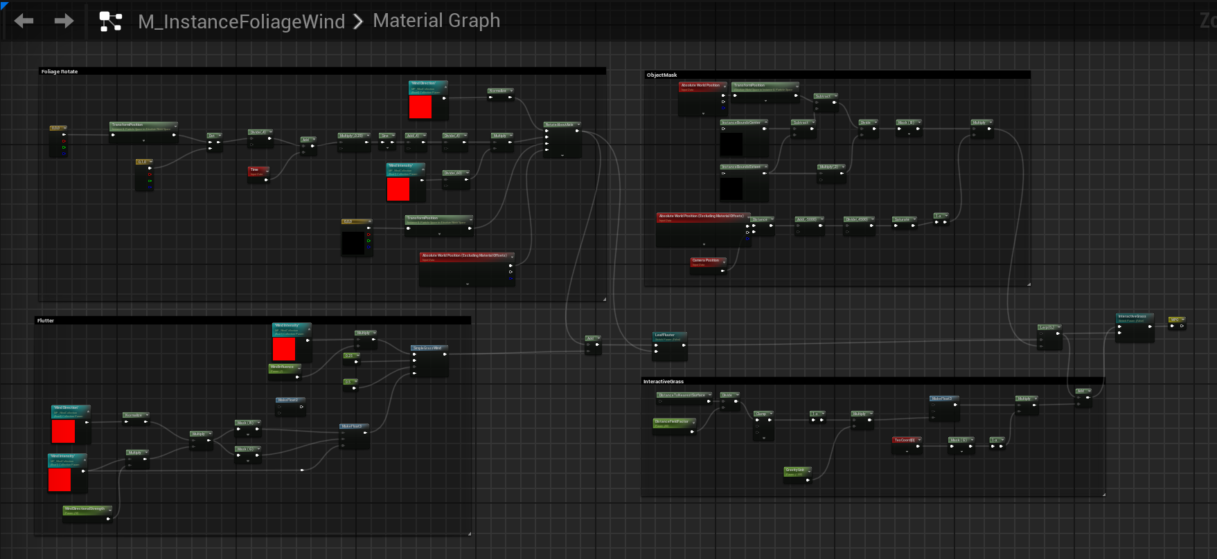 현재는 Tree나 Bush 혹은 Grass에 요소에 따라 대응되는 Material Instance를 만들어내는 역할을 하고 있습니다. 채집의 개념이 들어가게 된다면 마스터 머티리얼 내에서 채집되는 나무의 요소에 따라 영향을 받게되는 작업이 구분되어 질 수도 있습니다. 이때 같은 마스터 머티리얼을 사용하는 요소에 일관되게 작동하도록 만들어 주는 역할을 합니다.