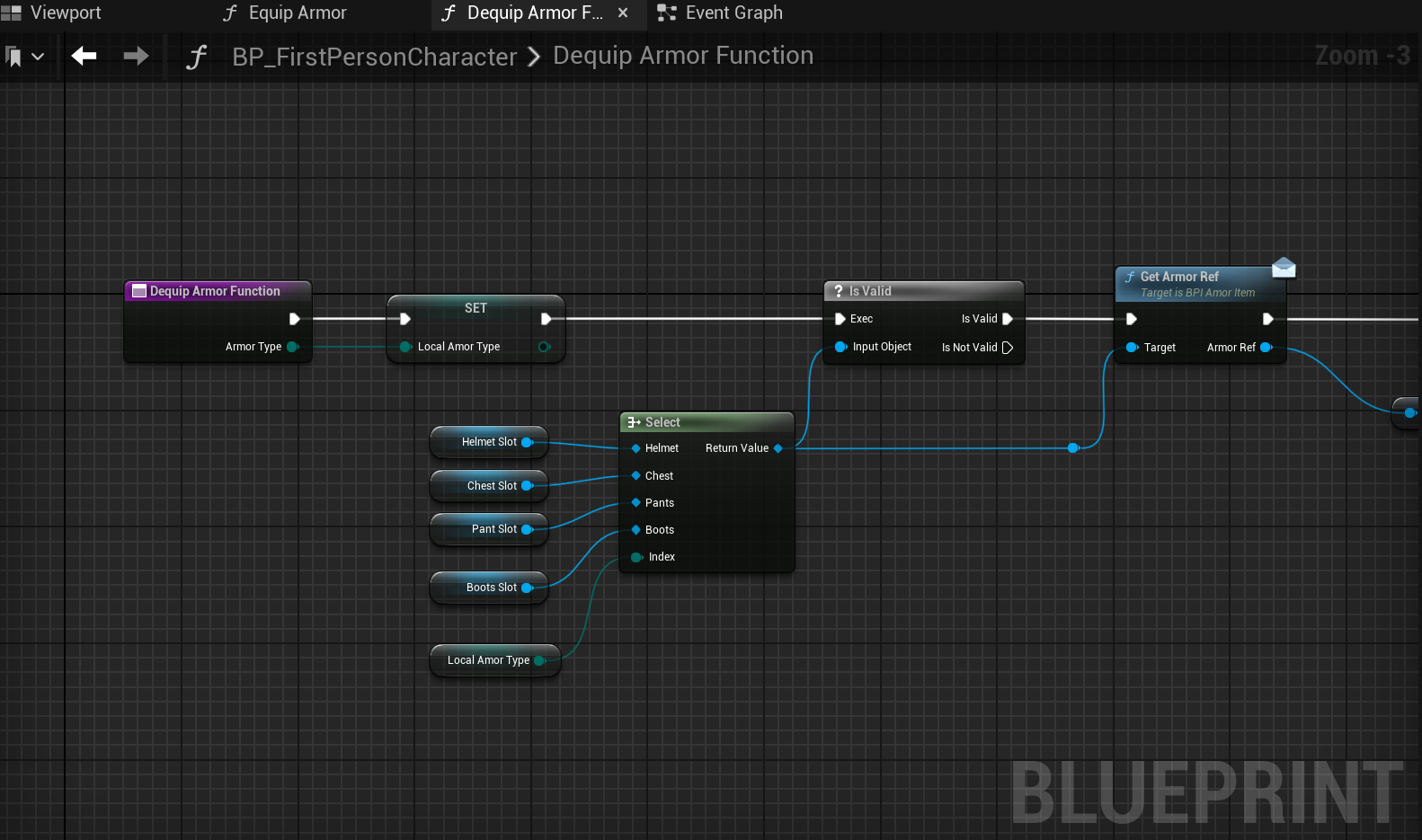 Armor Function은 위에서 언급된 개별적으로 제작된 Function들의 집합입니다. Armor Function이라는 기능이 있는게 아니라 해당 Function들이 모여서 Armor Function이라고 불리는 역할을 하게 되는 것입니다. 그리고 이 개별적인 Function들은 인벤토리와 아이템 드래그 및 플레이어 인터페이스 위젯 및 아이템을 장착시키고 해제 시키는 개념들과 모두 연동이 되게 됩니다. 유기적인 녀석이란 소리죠.
