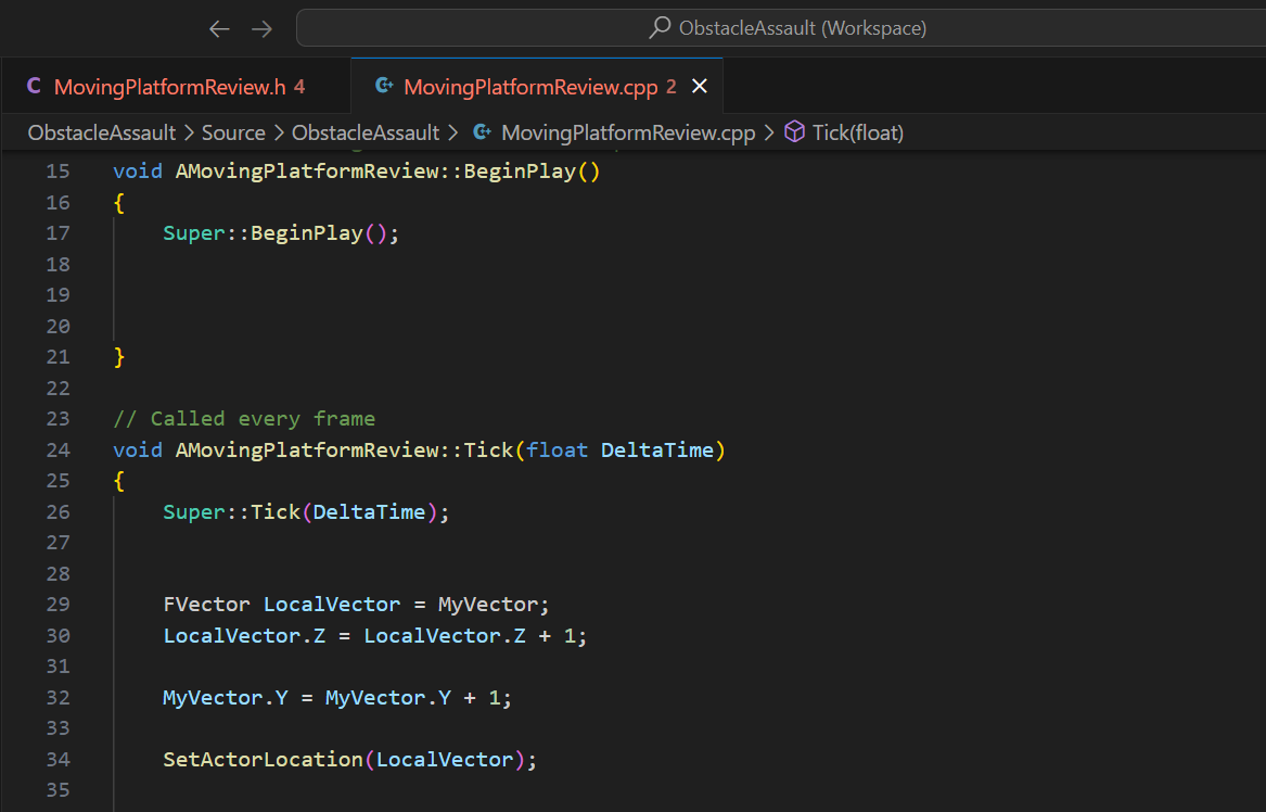 1. Header와 별개로 Tick에서 Fvector를 작성하고 LocalVector라는 네이밍을 부여하고 MyVector값과 같도록 명명